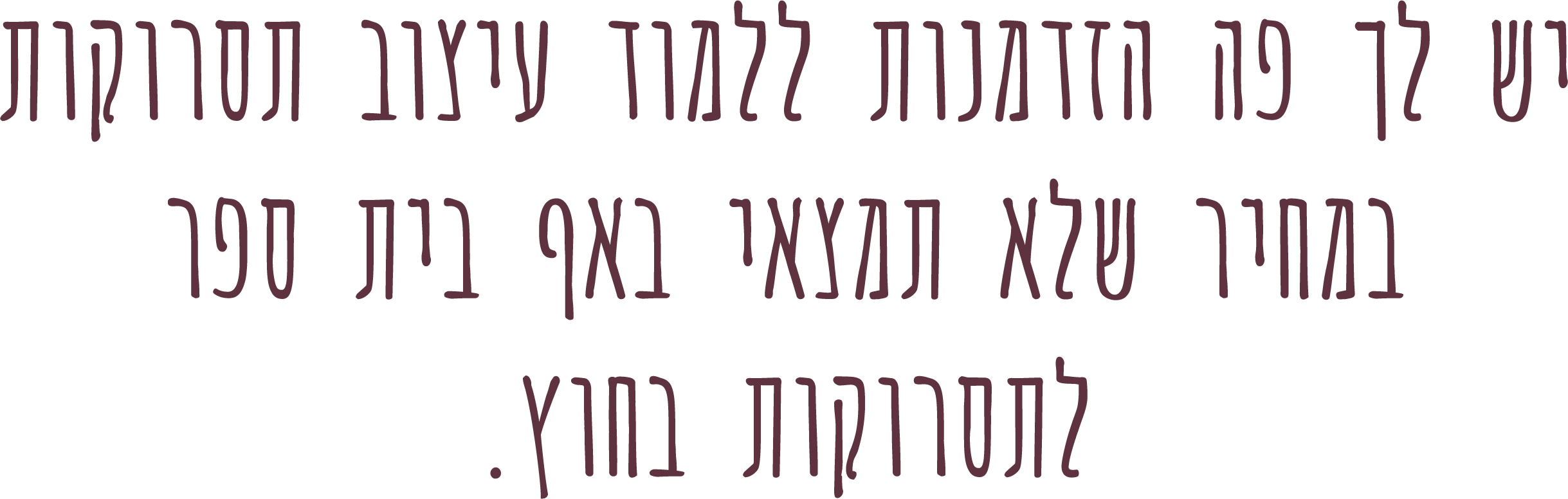 בכל זמן שתרצי, איפה שתרצי, כמה פעמים שתרצי, אני איתך אחת על אחת בסלון שלך, בחדר שלך- דרך המסך שלך 🙂 תוכלי לעצור אם לא הבנת משהו, לחזור אחורה,